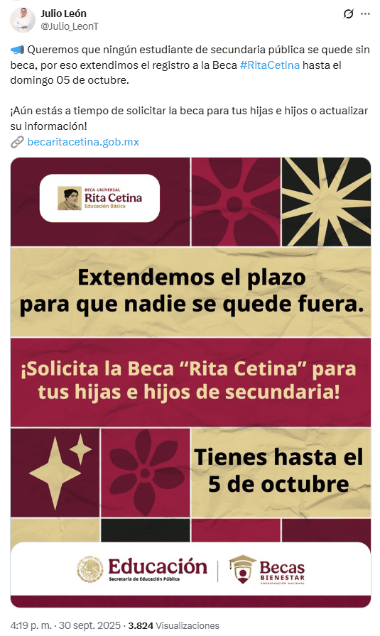 Ya inició el mes de octubre y más de alguno está interesado en conocer lo que está planeado con la Beca Rita Cetina lo que resta en el año.Sobre eso, se sabe que se trata un programa social impulsado por el Gobierno de México que busca apoyar a estudiantes de educación básica, enfocada al momento en los alumnos de secundaria en escuelas públicas.Con la llegada del mes de octubre, muchos padres de familia y alumnos se preguntan si habrá pago doble tras el inicio del ciclo escolar el pasado 1 de septiembre, y cuáles son las fechas tentativas de depósito, además de cuántos pagos restan en lo que queda de 2025.De acuerdo con la organización de los pagos en bimestres anteriores este año, los depósitos de octubre de 2025 se harán conforme a la inicial del primer apellido. Sin embargo, hasta el momento no se conocen las fechas exactas y según las declaraciones del coordinador de las Becas Bienestar, Julio León, las cuales circulan en redes sociales, los pagos iniciarían entre el 5 y 6 de octubre, aunque siguiendo con los días hábiles sería en la segunda fecha que cae en lunes.Además, ayer martes 30 de septiembre se dio a conocer que se extendía el periodo para nuevos registros hasta el 5 de octubre.Vale la pena recordar que aunque circulan versiones deun calendario de pagos tentativo, y la información oficial solo es dada a conocer mediante los canales de la Secretaría del Bienestar y todavía no ha sido confirmado algo al respecto.En lo que va del año, ya se han entregado tres depósitos de la Beca Rita Cetina. Anualmente son cinco.Los que ya se pagaron son:Durante julio y agosto no hubo pago por el periodo vacacional. Considerando que ya pasaron los meses de las vacaciones de verano, faltan dos depósitos en lo que resta del año:El programa de la beca Rita Cetina entrega un depósito bimestral de mil 900 pesos, además de un monto extra de 700 pesos por cada hijo adicional inscrito al mismo nivel educativo, que se entrega directamente mediante depósito en la tarjeta del Banco del Bienestar.Los beneficiarios de este apoyo del Gobierno de México, impulsado por la Presidenta Claudia Sheinbaum, deben revisar constantemente los avisos oficiales para confirmar las fechas exactas de pago y acudir con su tarjeta Bienestar al cajero o sucursal más cercana.*Mantente al día con las noticias, únete a nuestro canal de WhatsAppOF