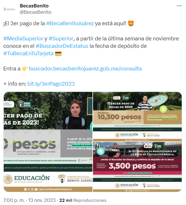 Ayer, el programa de Becas Benito Juárez recordó en sus redes sociales que si eres beneficiario del programa para educación media superior y superior, debes saber que será a partir de la última semana de noviembre que podrás conocer la fecha del depósito del pago de la tercera entrega del año, que corresponde a los meses de septiembre, octubre, noviembre y diciembre de 2023. Para saber cuándo pasar a retirar tu dinero sólo debes usar el buscador de estatus. Aquí te explicamos cómo usarlo.Debes tener en cuenta que tu tarjeta de las Becas Benito Juárez debe seguir activa, y que el monto de tu pago es de 3 mil 500 pesos.Si formas parte del programa Jóvenes Escribiendo el Futuro, el monto total del tercer pago debe ser de 10 mil 300 pesos. *Mantente al día con las noticias, únete a nuestro canal de WhatsAppOF