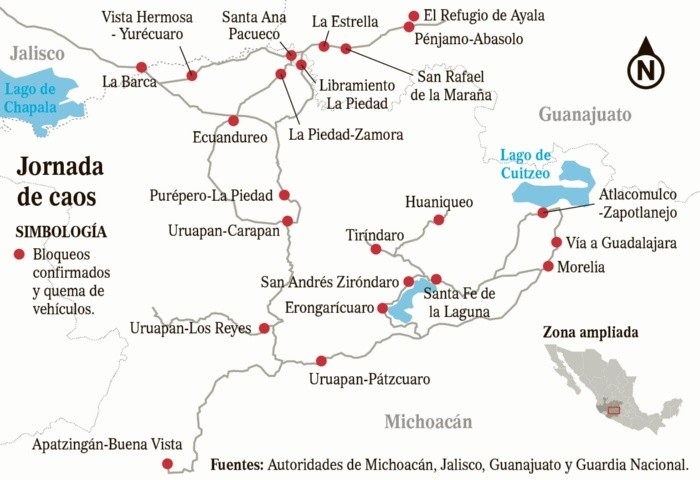 El secretario de Gobierno de Michoacán, Carlos Torres Piña, anunció que la captura de un objetivo criminal en Jalisco, desató la jornada de violencia en este estado, Michoacán y Guanajuato.Todavía no se ha confirmado el nombre del objetivo detenido.El miércoles se desató una serie de narcobloqueos y quema de vehículos en las tres entidades mencioandas, así como el incendio de tiendas de conveniencia.Hasta la noche de ayer se habían confirmado al menos una veintena de vehículos siniestrado en distintos puntos de Michoacán, cuatro más en el estado de Guanajuato y cerca de una decena en Jalisco, acerca de lo cual las autoridades locales no han brindado mayor información.Personal de la Guardia Civil, del Ejército Mexicano y de la Guardia Nacional desplegaron un operativo para frenar la violencia y dar con los responsables de la quema de vehículos, tiendas Oxxo y bloqueos carreteros en Michoacán y Jalisco.La Secretaría de Gobernación indicó que a las 21:00 horas del miércoles se restableció la circulación en los 13 puntos carreteros que fueron bloqueados, y que dos hombres fueron detenidos por estas acciones por miembros de la Fiscalía General del Estado en el municipio de Álvaro Obregón.Con información de SUN