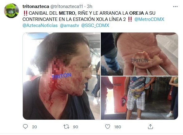 En una riña al interior del Metro Xola de la Ciudad de México, un sujeto le arrancó la oreja a un usuario de una mordida, por lo que fue detenido por la policía capitalina.Los hechos ocurrieron esta tarde, cuando vía radio fue solicitado el apoyo de policías en la estación por motivo de riña entre particulares.La pelea terminó cuando un sujeto le mordió la oreja a otro y se la desprendió del cuerpo.La oreja fue levantada del suelo por la víctima luego de los hechos, por lo que fue captado cuando la tenía en la palma de su mano.En redes sociales ya hay quien le llama al agresor el "Caníbal de Xola" o el "Caníbal del Metro". Otros recordaron el extraño episodio de boxeo de 1997, cuando Mike Tyson le mordió y arrancó un pedazo de oreja a Evander Holyfield en un combate por el título pesado en Las Vegas.JM