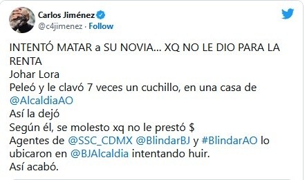 Un joven fue detenido por apuñalar en siete ocasiones a su novia por no pagar la renta de la vivienda en donde ambos residían en la alcaldía Álvaro Obregón, en la Ciudad de México.El coordinador de Seguridad Ciudadana y Prevención del Delito de Benito Juárez, César Barrientos, detalló que el sujeto fue detenido en dicha alcaldía luego de que tratara huir del lugar del crimen. "Ya fue presentado ante la Fiscalía de la Ciudad de México", escribió en sus redes sociales.De acuerdo con el periodista Carlos Jiménez, la mujer fue trasladada a un hospital para ser atendida.JM