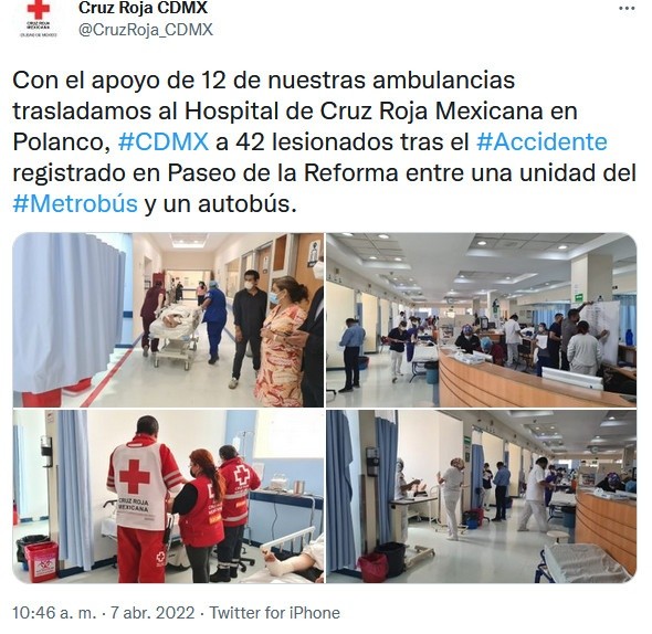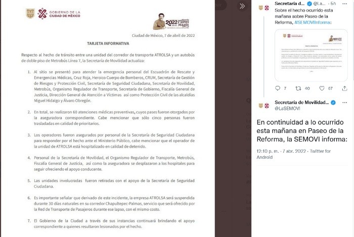Un fuerte choque entre dos unidades de transporte público en Paseo de la Reforma, en la Ciudad de México (CDMX), dejó al menos 60 heridos."En total, se realizaron 60 atenciones médicas preventivas, cuyos pases fueron otorgados por la aseguradora correspondiente. Cabe mencionar que solo cinco personas fueron trasladadas en calidad de prioritarios", dijo en un comunicado la Secretaría de Movilidad de la Ciudad de México (Semovi).El accidente ocurrió la mañana de este jueves cuando chocó una unidad del corredor de transporte y un autobús de doble piso de Metrobús Línea 7.Al sitio se presentó para atender la emergencia personal del Escuadrón de Rescate y Emergencias Médicas, Cruz Roja, Heroico Cuerpo de Bomberos, CRUM, Secretaría de Gestión de Riesgos y Protección Civil, Secretaría de Seguridad Ciudadana, Secretaría de Movilidad, entre otros organismos.En tanto, los operadores de las unidades chocadas fueron detenidos por personal de la Secretaría de Seguridad Ciudadana "para responder por el hecho ante el Ministerio Público"."Cabe mencionar que el operador de la unidad de Atrolsa -una modalidad de unidad de transporte terrestre- está hospitalizado en calidad de detenido", agregó el texto.Personal de la Secretaría de Movilidad, el organismo regulador de transporte, Metrobús, Fiscalía General de Justicia, así como la aseguradora se desplazaron a los hospitales para seguir ofreciendo el apoyo conducente, agregó el comunicado.Las unidades involucradas fueron retiradas con el apoyo de efectivos de seguridad de la capital. "Derivado de este incidente, la empresa ATROLSA será suspendida durante 30 días naturales en su corredor Chapultepec-Palmas, servicio que será ofrecido por la Red de Transporte de Pasajeros durante ese lapso, con el mismo costo", agregó Semovi.OF