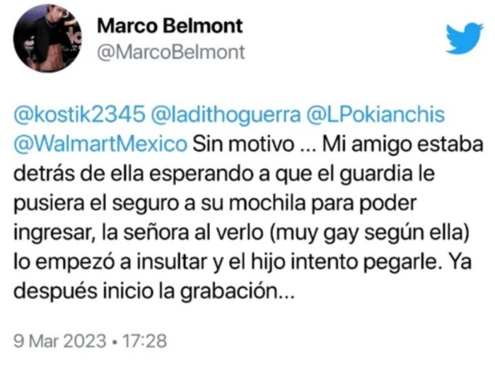 Hoy se viralizó un par de videos que subió un joven llamado Marco Belmont a Twitter, en donde denunció a una mujer y a su hijo por haber atacado a su amigo con insultos sumamente homofóbicos, incluso le deseó la muerte.Los hechos se registraron en una tienda Walmart en Ciudad de México, en avenida El Rosario, en la alcaldía Azcapotzalco. Una mujer, cuyo nombre se desconoce, se aproximó al amigo de Marco Belmont, una drag queen de nombre Pika Demian para atacarlo con insultos homofóbicos.En el primer visual del hilo de Twitter se comenta que el hijo de la mujer intentó golpear a Pika, pero al final no logró su objetivo porque los denunciantes se defendieron.Lo más preocupante de los videos fueron las palabras que la mujer le dedicó a la drag queen: "Sí, quiero que te maten, ¿eres hombre o mujer? ¡Sí me importa porque te ves bien gay! ¿Por qué me agredes gay, porque te digo gay?", fueron algunos ataques de la señora.Marco comentó que él y Pika no hicieron absolutamente nada para provocar a la mujer, pues ella simplemente al ver a Pika comenzó a insultarlo.CR