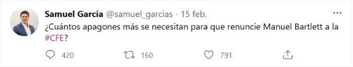 El número de afectados por el apagón del 15 de febrero aumentó de 4.8 millones a 5.9 millones de usuarios, ya que los cortes de luz que iniciaron la mañana de ayer en seos estados se extendieron a 23 estados para lograr compensar la demanda con la oferta.La Comisión Federal de Electricidad (CFE) explicó que actualmente hay un millón 62 mil clientes que siguen sin energía eléctrica, lo que afecta a 430.1 mil usuarios en Chihuahua, 49.5 mil en Coahuila, 431.8 mil en Nuevo León y 150.8 mil en Tamaulipas.Los estados afectados por el apagón de ayer en donde ya se restableció totalmente la energía fueron Durango y Zacatecas, lo que significa que hasta las 7 de la mañana del 16 de febrero; es decir, 24 horas después del apagón, el 82.07% del servicio logró restablecerse, pero falta casi el 18 por ciento.En el reporte que dio a conocer la CFE, explicó que a las 16:30 horas del 15 de febrero se pudo restablecer el 79% del servicio, pero el Centro Nacional de Control de Energía (Cenace) pidió a las 19:30 interrumpir el suministro para estabilizar el Sistema Eléctrico Nacional, lo que afectó a 5.9 millones de usuarios."Las actividades de restablecimiento continuarán conforme a las instrucciones que emita el CENACE para garantizar la estabilidad del Sistema Eléctrico Nacional", añadió CFE."¿Cuántos apagones más se necesitan para que renuncie Bartlett?", cuestionó el candidato de Movimiento Ciudadano al gobierno de Nuevo León, Samuel García Sepúlveda, al acusar de ineptitud en el peor momento al director de la CFE.Las críticas del senador con licencia se dieron ante los cortes de energía eléctrica desde la mañana del domingo se han registrado en los estados del norte del país, como consecuencia del intenso frío que aumentó la demanda del fluido eléctrico, al tiempo que el mismo fenómeno hizo que Estados Unidos suspendiera las ventas de gas para las plantas termoeléctricas en México, tanto para atender su propia demanda como por el congelamiento de los ductos.A través de su cuenta de Twitter, Samuel García señaló que "a Bartlett ya se le hizo costumbre que se le caiga el sistema en la CFE todos los días".El candidato agregó que el apagón de Nuevo León sucede cuando se registran temperaturas bajo cero. "En el peor momento lucen su ineptitud", expresó.JM