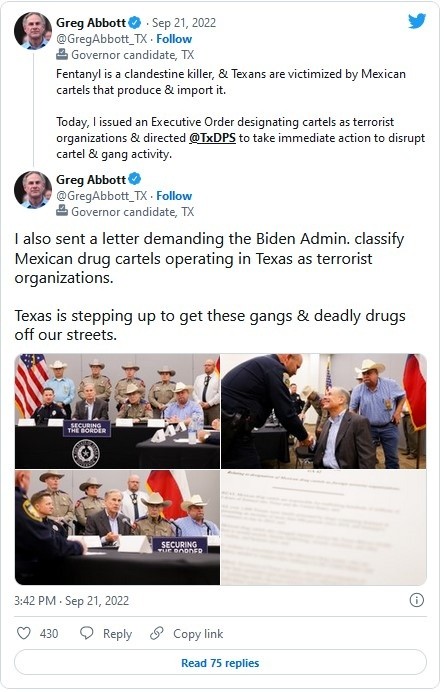 El gobernador del estado de Texas, Greg Abbott, emitió este miércoles una orden ejecutiva para designar a cárteles mexicanos como "organizaciones terroristas" e instó al Departamento de Seguridad Pública (DPS) a tomar medidas para mantener seguros a sus ciudadanos en medio de la creciente crisis de fentanilo.En medio de una conferencia de prensa en Midland, el gobernador envió al presidente Joe Biden y a la vicepresidenta Kamala Harris una carta en la que solicitó clasificar como territorios "terroristas" federales al Cártel de Sinaloa y el Cártel Nueva Generación, así como otros cárteles que producen y distribuyen fentanilo letal."Los cárteles son terroristas, y es hora de que los tratemos de esa manera. De hecho, más estadounidenses murieron por envenenamiento con fentanilo el año pasado que todos los ataques terroristas en todo el mundo en los últimos 100 años. Para salvar a nuestro país, particularmente a nuestra próxima generación, debemos hacer más para sacar el fentanilo de nuestras calles", dijo Abbott según un comunicado de la oficina del gobernador de Texas.Asimismo, ordenó al Departamento de Seguridad Pública, así como a las autoridades, a intensificar los trabajos de búsqueda e identifiquen a las pandillas de Texas que apoyan a los cárteles mexicanos y confisquen sus bienes para interrumpir las redes del tráfico de drogas.El gobernador enfatizó que se necesita de una acción decisiva inmediata de parte de la Administración Biden para combatir esta crisis mortal que afecta a la nación.La carta además ordena a las agencias estatales que coordinen los esfuerzos para generar conciencia sobre la letalidad y la prevalencia del fentanilo.JM