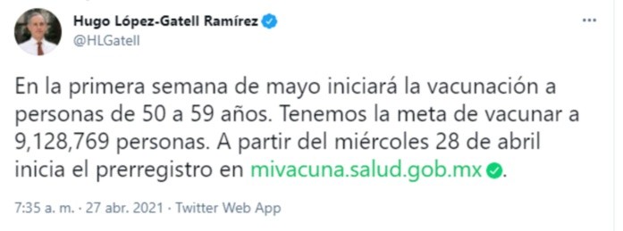 El Gobierno de México anunció la fecha en la que las personas de 50 a 59 años podrán registrarse para recibir la vacuna contra el COVID-19.Este iniciará a partir del miércoles 28 de abril, detalló Ruy López Ridaura, director general del Centro Nacional de Programas Preventivos y Control de Enfermedades.Por su parte, Hugo López-Gatell Ramírez, subsecretario de Prevención y Promoción de la Salud, informó a través de su cuenta de Twitter que será la primera semana de mayo cuando inicie la aplicación de la vacuna en este grupo poblacional.''En la primera semana de mayo iniciará la vacunación a personas de 50 a 59 años. Tenemos la meta de vacunar a 9,128,769 personas. A partir del miércoles 28 de abril inicia el prerregistro en http://mivacuna.salud.gob.mx'', dijo López-Gatell. Se espera inmunizar a más de 9.1 millones de personas, tras completar la inmunización de los mayores de 60 años."El miércoles, mañana, se abre la página para la inscripción a todos, de 50 a 59 (años), esto de acuerdo a la estrategia que definen los médicos sobre qué lugares se tienen que atender primero, desde luego pensando en la disponibilidad de las vacunas", indicó durante su conferencia mañanera el Presidente Andrés Manuel López Obrador (AMLO).Las autoridades estiman que hay nueve millones 128 mil 769 adultos de 50 a 59 años en México.El anuncio de la nueva etapa del plan de vacunación de México ocurre después de completar la inoculación, con al menos una dosis, de 11 millones 103 mil 825 adultos mayores de 60 años en dos mil 456 municipios del país.OF