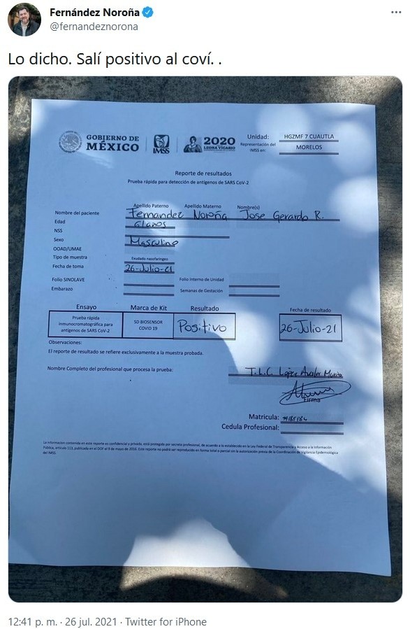 Gerardo Fernández Noroña, diputado del Partido del Trabajo (PT), informó hoy que dio positivo a COVID-19.El legislador compartió en su cuenta de Twitter la imagen del resultado de su prueba rápida de antígenos, realizada este lunes 26 de julio, en la que salió positivo."Lo dicho. Salí positivo al coví", escribió.El pasado 23 de julio, el diputado informó que la persona que le ayuda a conducir su vehículo dio positivo al coronavirus. Y también compartió que él se hizo la prueba, que resultó negativa."Llevaba tres días pensando que era una gripe leve y lo mandé a hacerse la prueba. Convive conmigo todo el tiempo. Así que me hice la prueba y para desesperación de la derecha, volví a salir negativo", informó entonces.En diferentes ocasiones, Fernández Noroña, quien aspira por la Presidencia de México en 2024, ha expresado su rechazo al uso del cubrebocas.En noviembre del año pasado, la negativa del diputado petista a utilizar cubrebocas dentro de la sala de Consejo General del Instituto Nacional Electoral (INE), obligó a que el consejero presidente, Lorenzo Córdova, decretara un receso para el desalojo del lugar."Me quieren amordazado, hablaré sin mordaza. Si usted me quiere censurar, yo no puedo hablar amordazado", expuso en su momento.También en octubre del año pasado, Gerardo Fernández Noroña anunció que salió negativo a coronavirus.Asimismo, en enero de este año, viajó a Caracas para asistir a la instalación de la Asamblea Nacional de Venezuela, sin embargo se negó a ir debido al uso obligatorio de cubrebocas."Con la novedad que hay que acudir con cubrebocas a la instalación de la Asamblea Nacional en Venezuela. Así que viajé en vano, me quedaré todo el día en el hotel", expuso el legislador.Si te interesó esta noticia y quieres saber más, entonces descarga y descubre INFORMAPlus, la aplicación digital de EL INFORMADOR, en donde tenemos contenidos exclusivos, seleccionados por nuestros editores, para darles una experiencia más completa a los lectores. Descarga la aplicación y pruébala GRATIS por treinta días. Para iOS: https://apple.co/35jaVgbPara Android: https://bit.ly/3gwVSEVIM