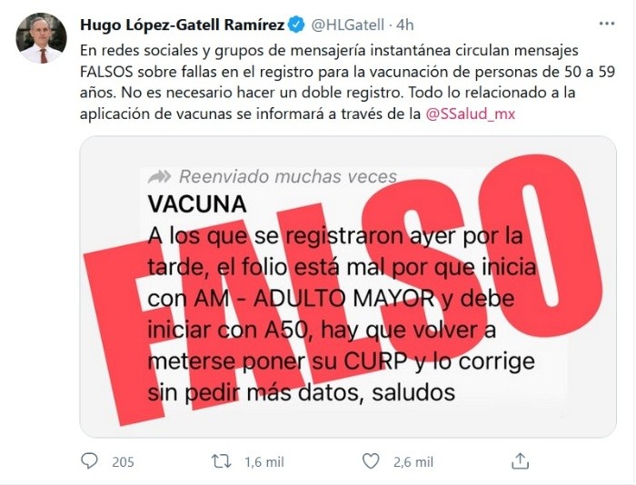 El subsecretario de Prevención y Promoción de la Salud, Hugo López-Gatell Ramírez, llamó a los mexicanos a no dejarse llevar por cadenas que circulan a través de redes sociales y que señalan que ha habido fallas en el registro para la vacunación en el grupo de 50 a 59 años de edad; el funcionario afirmó que todo lo relacionado con la vacunación contra el COVID-19 se dará a conocer por la Secretaría de Salud."En redes sociales y grupos de mensajería instantánea circulan mensajes FALSOS sobre fallas en el registro para la vacunación de personas de 50 a 59 años. No es necesario hacer un doble registro. Todo lo relacionado a la aplicación de vacunas se informará a través de la @Ssalud_mx", publicó el funcionario en su cuenta de Twitter.López-Gatell se refirió a un mensaje que se hizo viral en redes sociales, el cual indicaba que aquellas personas que se registraron ayer en la página de mivacuna.salud.gob.mx debían hacerlo de nuevo debido a errores en el registro.Este miércoles por la mañana, el subsecretario detalló que luego de que ayer se abriera el portal para que personas de 50 a 59 años se registraran para recibir la dosis, se contabilizaron dos millones 300 mil solicitudes.JM
