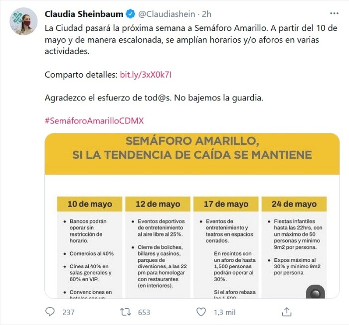 Luego de permanecer por tres semanas seguidas en semáforo epidemiológico naranja, la Ciudad de México pasó al color amarillo la semana 10 al 16 de mayo."La Ciudad pasará la próxima semana a semáforo amarillo. Agradezco el esfuerzo de tod@s. No bajemos la guardia", expresó la jefa de Gobierno, Claudia Sheinbaum.Eduardo Clark García Dobarganes, director general de la Agencia Digital de Innovación Pública (ADIP), explicó que la tendencia de hospitalizados por coronavirus sigue a la baja; de mil 681 personas en hospitales la semana pasada, pasó a mil 404 esta semana.Agregó que la ocupación hospitalaria es de 16.52%; es decir que hay mil 308 camas ocupadas y seis mil 608 disponibles; con relación a los ingresos hospitalarios, refirió que en el Valle de México hubo una reducción de 219 personas comparado con la semana pasada, pasando de mil 237 a mil 18.Autoridades de la Ciudad de México informaron de una reactivación escalonada en semáforo amarillo si la tendencia a la baja se mantiene. Entre las medidas para el 10 de mayo está la apertura de bancos sin restricción de horarios, comercios al 40% de aforo, cines con 40% de aforo y convenciones en hoteles con un máximo de 50 y mínimo nueve metros cuadrados por persona.El titular de la Agencia Digital de Innovación Pública, José Antonio Peña Merino, informó que para el 12 de mayo regresarán eventos deportivos de entretenimiento al aire libre al 25% de aforo, incluyendo partidos de futbol, mientras que los boliches, billares, casinos y parques de diversiones podrán operar hasta las 22:00 horas.Agregó que el 17 de mayo regresan eventos de entretenimiento y teatros en especial cerrados, en recintos con aforo de hasta mil 500 personas. El 24 de mayo se permiten las fiestas infantiles hasta las 22:00 horas, con máximo de 50 personas; y exposiciones y convenciones.También recordó que a partir de este sábado inicia el registro para el programa de Ciudad al Aire Libre con enseres fijos.Sheinbaum indicó que es muy importante que en todas las actividades reabiertas deba haber filtros sanitarios y uso de cubrebocas, e hizo un llamado a seguirnos cuidando frente a la pandemia.Ante la baja de contagios de coronavirus, la jefa de Gobierno destacó la disciplina de los capitalinos, el trabajo en los kioscos de salud para realizar las pruebas, la vacunación, el clima y estudios de personas con COVID-19 que ya tienen inmunidad.JM