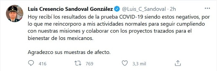 El secretario de la Defensa Nacional, Luis Cresencio Sandoval, anunció la tarde de este martes que se reincorporó a sus actividades normales tras superar el COVID-19, al que dio positivo el pasado 17 de febrero."Hoy recibí los resultados de la prueba COVID-19 siendo estos negativos, por lo que me reincorporo a mis actividades normales para seguir cumpliendo con nuestras misiones y colaborar con los proyectos trazados para el bienestar de los mexicanos", informó el general a través de un mensaje en su cuenta de Twitter.El mando militar agradeció las muestras de afecto.El 2 de marzo, Sandoval González se hizo la prueba de seguimiento por COVID-19, a la que volvió a dar positivo, por lo que continuó aislado hasta este martes.El general dio positivo a coronavirus el 17 de febrero y desde ese día se apoyó en los funcionarios de la Sedena, conforme a la cadena de mando, para seguir atendiendo los temas de la dependencia.JM
