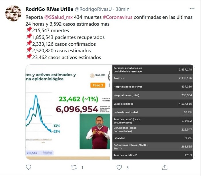 México llegó, al corte de este 27 de abril, a un total de 215 mil 547 muertes por COVID-19, según informaron autoridades de la Secretaría de Salud; esto significa que, en las últimas 24 horas, el país sumó 434 decesos por coronavirus.En tanto, reportó dos millones 333 mil 126 casos confirmados del virus en todo el país. Es decir, tres mil 592 nuevos contagios desde la última jornada.El director general de Promoción de la Salud, Ricardo Cortés Alcalá, informó que hay 23 mil 462 casos activos estimados en el país.El funcionario de salud informó que el pasado lunes se aplicaron 161 mil 711 dosis de la vacuna contra el nuevo coronavirus; asimismo, agregó que en total se han aplicado 16 millones 687 mil 189 dosis de las vacunas en todo el país desde el pasado diciembre.JM