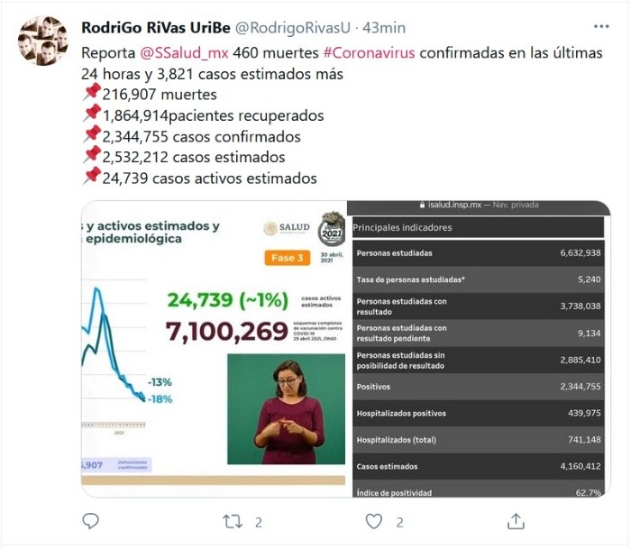 México reportó 460 nuevas muertes por COVID-19 en las últimas 24 horas para llegar a un total de 216 mil 907 decesos, informó este viernes la Secretaría de Salud.Las autoridades sanitarias también registraron tres mil 821 nuevos contagios en su informe técnico diario sobre la incidencia del coronavirus, para un total de dos millones 344 mil 755 casos confirmados.Desde el comienzo de la emergencia sanitaria, México ha estudiado a 6.63 millones de pacientes, informó el titular de Promoción de la Salud de México, Ricardo Cortés Alcalá, en conferencia de prensa.Precisó que el número de casos estimados es de dos millones 532 mil 212 al considerar aquellos que esperan el resultado de la prueba, entre los que hay 24 mil 739 casos activos estimados, es decir, el 1 %, que han presentado síntomas en los últimos 14 días.Además, reportó un millón 864 mil 914 personas en el país que se consideran recuperadas después de haber padecido la enfermedad y tres millones 853 mil 823 con un resultado negativo.También se informó que la ocupación media de camas generales en los hospitales mexicanos es del 12 %, y del 17 % en cuanto a camas de terapia intensiva con respirador.En la conferencia se explicó que hasta este día se han administrado 17 millones 718 mil 806 dosis de la vacuna anticovid, 360 mil 815 durante la jornada del viernes.Además se informó que un total de siete millones 100 mil 269 personas han recibido las dosis necesarias para completar el esquema de vacunación.El programa de vacunación contempla por ahora a los adultos mayores de 60 años, al personal médico y a parte del personal educativo.Sobre la vacunación al personal educativo en los estados de Coahuila, Chiapas, Nayarit, Tamaulipas y Veracruz, y previamente en Campeche, se reportaron 706 mil 976 personas con 705 mil 999 esquemas completos.JM
