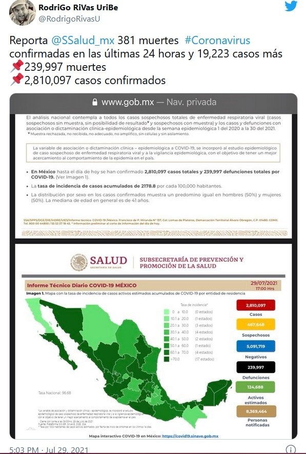 La Secretaría de Salud (Ssa) informó que, al corte de este jueves 29 de julio, México llegó a 239 mil 997 muertes por COVID-19.Esto significa que el país registró 381 decesos por esta enfermedad más que el miércoles. Además, el país acumuló dos millones 810 mil 097 casos positivos por coronavirus, al reportar 19 mil 223 contagios en las últimas 24 horas.Asimismo, contabilizó 467 mil 648 casos sospechosos y cinco millones 091 mil 719 casos negativos.La Ciudad de México, el Estado de México, Jalisco, Nuevo León, Veracruz, Sinaloa, Quintana Roo, Guerrero y Tabasco son las entidades con mayor número de casos activos.Después de dichos estados, siguen Nayarit, Sonora, SanLuis Potosí, Guanajuato, Oaxaca, Baja California Sur, Yucatán, Hidalgo, Colima, Michoacán, Puebla, Querétaro, Tamaulipas, Coahuila y Durango como las entidades que concentran el 96% de los casos activos del país.La Ciudad de México continúa siendo la entidad con más casos acumulados del país y representa por sí sola el 27% de los contagios.Este miércoles, 28 de julio, fueron aplicadas un millón 176 mil 387 dosis, por lo que en todo el país se han suministrado 64 millones 489 mil 596 dosis de la vacuna anticovid.En México, explicó Salud, la mitad de la población mayor de 18 años ya está vacunada contra el coronavirus.Si te interesó esta noticia y quieres saber más, entonces descarga y descubre INFORMAPlus, la aplicación digital de EL INFORMADOR, en donde tenemos contenidos exclusivos, seleccionados por nuestros editores, para darles una experiencia más completa a los lectores.Descarga la aplicación y pruébala GRATIS por treinta días.Para iOS: https://apple.co/35jaVgbPara Android: https://bit.ly/3gwVSEVJM