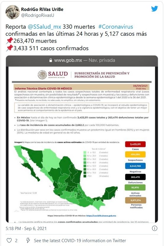 La Secretaría de Salud reportó este lunes 330 nuevas muertes por COVID-19 para un total de 263 mil 470 defunciones, además de otros cinco mil 127 nuevos casos para llegar a tres millones 433 mil 511 contagios, durante la tercera ola de la pandemia en el país.Con estas cifras, México se mantiene como el cuarto país con más muertes por COVID-19 por detrás de Estados Unidos, Brasil y la India, y el decimoquinto en número de contagios confirmados, según el recuento de la Universidad Johns Hopkins.Las autoridades sanitarias reconocen que, con base en las actas de defunción, la pandemia rondaría los 400 mil fallecidos en el país y estiman que México acumula en realidad tres millones 642 mil 370 casos de contagio.De esta cifra total, 92 mil 970 son los casos activos, que han presentado síntomas durante los últimos 14 días y que suponen el 2.6 por ciento.Además, desde el inicio de la pandemia se han recuperado dos millones 782 mil 729 personas.La ocupación media de camas generales es del 46 % y del 41 % para camas de terapia intensiva.Las autoridades también indicaron que hasta ahora el programa de vacunación, que contempla a todos los mayores de 18 años, ha administrado 87.22 millones de dosis de la vacuna anticovid, al sumar 210 mil 494 en la última jornada.El reporte también precisó que 35.81 millones de personas han completado el esquema de vacunación, del total de 126 millones de habitantes que tiene el país.Si te interesó esta noticia y quieres saber más, entonces descarga y descubre INFORMAPlus, la aplicación digital de EL INFORMADOR, en donde tenemos contenidos exclusivos, seleccionados por nuestros editores, para darles una experiencia más completa a los lectores. Si eres suscriptor de EL INFORMADOR tu acceso está incluido, solicítalo al 33 3678-7777.Descarga la aplicación y pruébala GRATIS por treinta días.Para iOS: https://apple.co/35jaVgbPara Android: https://bit.ly/3gwVSEVJM