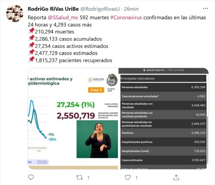México reportó 592 nuevas muertes por coronavirus en las últimas 24 horas para acumular un total de 210 mil 294 fallecimientos por la enfermedad, informó este martes la Secretaría de Salud.Las autoridades sanitarias también reportaron cuatro mil 293 nuevos contagios en su informe técnico diario sobre la incidencia del coronavirus, para un total de dos millones 286 mil 133 casos confirmados.Con estos datos, México es el tercer país del mundo con más decesos, por detrás de Estados Unidos y Brasil y el decimocuarto en número de contagios, según la Universidad Johns Hopkins.El número de casos estimados es de dos millones 477 mil 729 al considerar aquellos que esperan el resultado de la prueba. Entre ellos, hay 27 mil 254 casos activos estimados; es decir, que han presentado síntomas en los últimos 14 días.Además, un millón 815 mil 237 personas en el país se consideran recuperadas después de haber padecido la enfermedad.JM