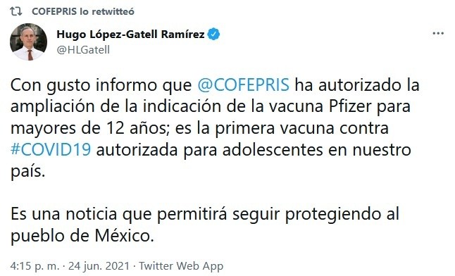 La vacuna Pfizer - BioNTech contra el COVID-19 se convirtió en la primera en ser autorizada por el Gobierno de México para su aplicación en adolescentes a partir de los 12 años.La Comisión Federal para la Protección contra Riesgos Sanitarios (Cofepris) informó hoy emitió la modificación a la autorización para uso de emergencia de la vacuna Pfizer-BioNTech para su aplicación a partir de los 12 años.En un comunicado, recordó que la vacuna fue autorizada para uso de emergencia desde el 11 de diciembre de 2020, cuando fue sometida a consideración para su aplicación a mayores de 18 años."Esta autorización de uso de emergencia y su respectiva ampliación certifican que el biológico cumple los requisitos de calidad, seguridad y eficacia necesarios para su aplicación a personas de 12 años en adelante", agregó.IM
