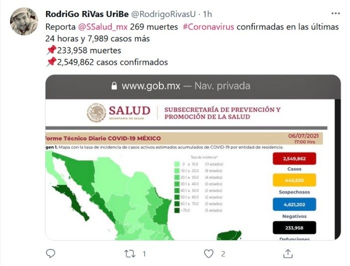 México reportó 269 nuevas muertes por COVID-19 en las últimas 24 horas, para un total de 233 mil 958 fallecimientos, informó este martes la Secretaría de Salud, que también indicó que el país llegó a 47.73 millones de vacunas aplicadas contra el coronavirus.Además, el informe técnico diario registró siete mil 989 nuevos contagios que elevan a dos millones 549 mil 862 los casos confirmados.Con estas cifras, México se mantiene como el cuarto país del mundo con más muertes por covid-19, detrás de Estados Unidos, Brasil y la India, y es decimoquinto en número de contagios confirmados, según el recuento de la Universidad Johns Hopkins.El reporte de este martes indicó que, desde el comienzo de la emergencia, México ha estudiado 7.61 millones de pacientes.Además, las autoridades sanitarias estiman que el número real de contagios es de dos millones 736 mil 611. De esta cifra están activas 43.573 personas que han presentado síntomas durante los últimos 14 días y que representan poco más del 1.5 % del total.También se reportó que dos millones 023 mil 270 personas están consideradas como recuperadas después de haber padecido la enfermedad.La ocupación media de camas generales en los hospitales mexicanos es del 21 % y del 17 % para camas de terapia intensiva.El informe indicó también que hasta ahora se han administrado 47 millones 739 mil 783 dosis de la vacuna anti COVID, al sumar 421 mil 785 en la jornada del lunes.Además, precisó que 19.93 millones de personas han recibido las dosis necesarias para completar el esquema de vacunación en México, que tiene 126 millones de habitantes.El programa de vacunación contempla, por ahora, a los mayores de 30 años, mujeres embarazadas, personal médico y educativo, así como toda la población mayor de edad del estado de Baja California como parte de un plan piloto para reabrir la frontera con Estados Unidos.JM