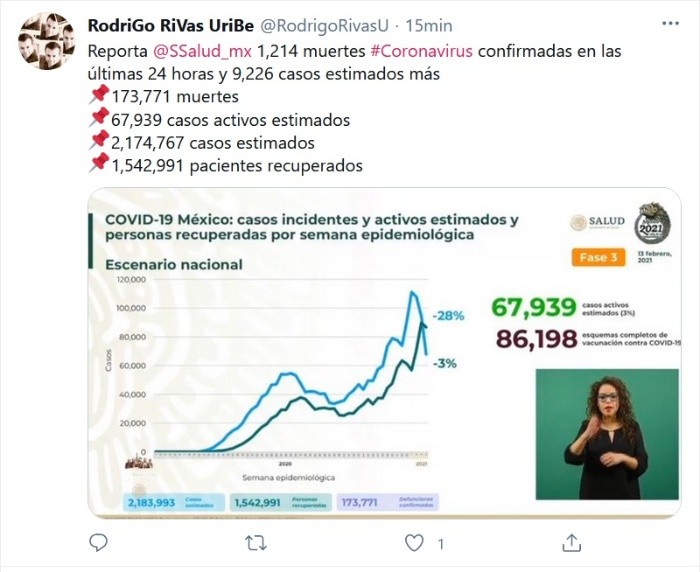 La Secretaría de Salud informó este sábado de que su país sumó mil 214 nuevos decesos por COVID-19 en las últimas 24 horas, para un total de 173 mil 771 muertos.Además, la directora general del Centro Nacional para la Prevención y el Control del VIH, Alethse de la Torre, indicó en conferencia de prensa que México acumula dos millones 183 mil 993 casos estimados de la enfermedad.Con estas cifras, México ocupa el tercer lugar del mundo con más decesos por la pandemia, detrás de Estados Unidos y Brasil, y el decimotercer puesto en número de contagios, de acuerdo con la Universidad estadounidense Johns Hopkins.De la Torre señaló que hay 67 mil 939 casos activos estimados; es decir, un 3 % del total que han presentado síntomas en las últimas dos semanas.Además explicó que existe una ocupación media del 43 % de camas generales, entre los que resaltan los de la Ciudad de México (74 %), el Estado de México (67 %) y Morelos (63 %) como los más altos de saturación.En cuanto a camas con ventilador para casos graves, están ocupadas el 42 % a nivel nacional; los estados con mayor ocupación son la Ciudad de México (70 %), Tlaxcala (57 %) y Oaxaca (55 por ciento).A raíz de una reducción de ingresados, la Ciudad de México y el Estado de México anunciaron este viernes que pasaron del semáforo rojo al naranja, por lo que podrán ampliar horarios y aforos de negocios, así como de restaurantes.En la conferencia de prensa se informó que se han aplicado 726 mil 313 vacunas contra el nuevo coronavirus, pero sólo 86 mil 198 personas han recibido ya las dos dosis necesarias de la vacuna Pfizer para lograr la inmunidad.México tiene acuerdos de precompra para 34.4 millones de dosis de Pfizer, 77.4 millones de la británica AstraZeneca, 35 millones de la china CanSino, 24 millones de la rusa Sputnik V y 51.5 millones de la plataforma Covax, impulsada por la Organización Mundial de la Salud (OMS).JM