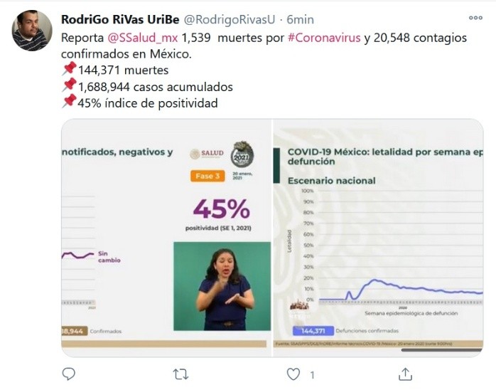México reportó mil 539 nuevas muertes por el coronavirus en las últimas 24 horas, la segunda cifra más alta durante la pandemia, con lo que el número de víctimas mortales llegó a 144 mil 371, informaron este martes autoridades de la Secretaría de Salud.La cifra máxima es de mil 584 decesos reportada este martes.Además, se contabilizaron 20 mil 548 nuevos contagios de COVID-19, la segunda cifra más alta tras los 21 mil 366 del pasado viernes, para un total de un millón 688 mil 944 casos confirmados.Con estos datos, México ocupa el decimotercer lugar mundial en número de contagios y se mantiene como el cuarto país del orbe con más decesos por la pandemia, detrás de Estados Unidos, Brasil e India, según la Universidad estadounidense Johns Hopkins.Desde el inicio de la pandemia en México han sido estudiados cuatro millones 244 mil 955 pacientes con un índice de positividad del 45 %, informó el director de Información Epidemiológica, Christian Zaragoza, en conferencia de prensa en Palacio Nacional.Entre los pacientes estudiados se tienen un millón 688 mil 944 que tuvieron un positivo a la infección viral, dos millones 130 mil 111 con un resultado negativo y 425 mil 900 que se mantienen como casos sospechosos.Además, el funcionario destacó que un millón 264 mil 780 pacientes son clasificados como personas recuperadas.Las proyecciones de las autoridades indican que en el país existen un millón 884 mil 272 casos estimados y que el 6 % de ellos, 108 mil 991 son los que representan la epidemia activa en México, al ser pacientes que desarrollaron sus síntomas en los últimos 14 días.La ocupación nacional de camas de hospitalización general es del 61 % y los estados con mayores índices son Ciudad de México (89 %) y Guanajuato (87 %) y Estado de México (85 por ciento).JM