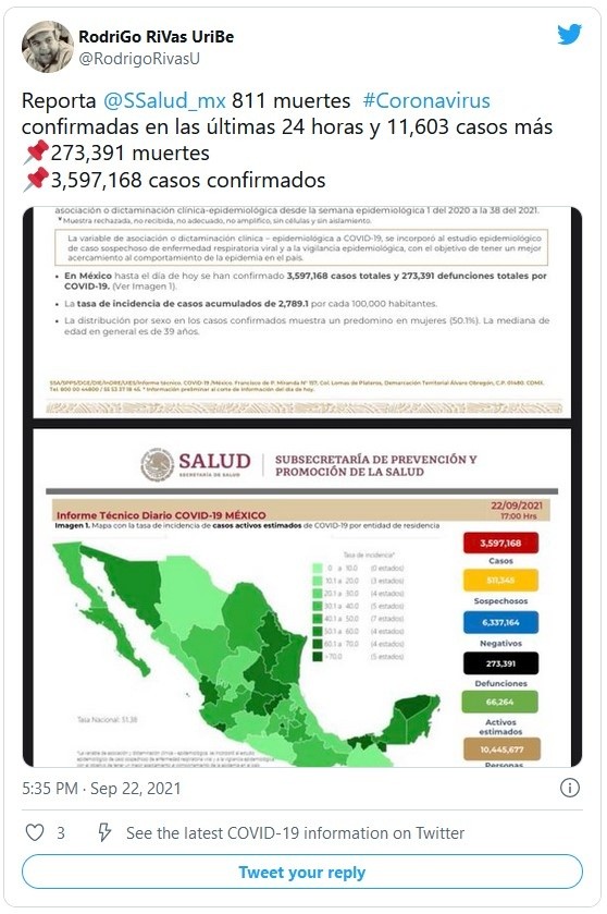 Al corte de este miércoles 22 de septiembre, México acumuló 273 mil 391 muertes por COVID-19, esto es, 811 fallecimientos más que el día anterior, informó la Secretaría de Salud.Asimismo, se detalló que en las últimas 24 horas, el país sumó 11 mil 603 contagios, para dar un total de tres millones 597 mil 168 casos confirmados.A través del informe técnico, las autoridades sanitarias detallaron que las 10 primeras entidades que acumulan el mayor número de casos son la Ciudad de México, Estado de México, Nuevo León, Guanajuato, Jalisco, Tabasco, Puebla, Veracruz, Sonora y San Luis Potosí, que en conjunto conforman el 66% de todos los casos acumulados registrados en el país.Respecto a los detalles del plan de vacunación, el subsecretario de Prevención y Promoción de la Salud, Hugo López-Gatell, indicó que al corte del martes 21 de septiembre se aplicaron 712 mil 551 dosis de la vacuna contra COVID-19.Indicó que desde el inicio de la estrategia nacional de vacunación se han aplicado en total 96 millones 793 mil 184 dosis.Si te interesó esta noticia y quieres saber más, entonces descarga y descubre INFORMAPlus, la aplicación digital de EL INFORMADOR, en donde tenemos contenidos exclusivos, seleccionados por nuestros editores, para darles una experiencia más completa a los lectores. Si eres suscriptor de EL INFORMADOR tu acceso está incluido, solicítalo al 33 3678-7777.Descarga la aplicación y pruébala GRATIS por treinta días.Para iOS: https://apple.co/35jaVgbPara Android: https://bit.ly/3gwVSEVJM