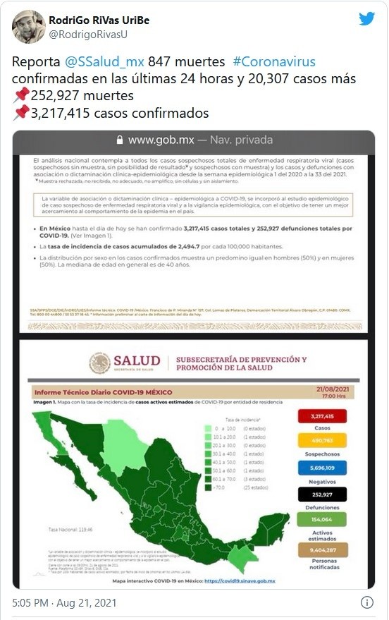 La Secretaría de Salud (Ssa) informó que al corte de este sábado, México acumuló un total de tres millones 217 mil 415 casos de COVID-19, 20 mil 307 más que el día anterior.Asimismo, expuso en su informe técnico diario sobre la situación de la pandemia de coronavirus en el país, se registraron 847 nuevas muertes en las últimas 24 horas, para dar un total de 252 mil 927 desde el inicio de la pandemia.De acuerdo con el documento, las 10 primeras entidades que acumulan el mayor número de casos son la Ciudad de México, el Estado de México, Nuevo León, Guanajuato, Jalisco, Tabasco, Puebla, Sonora, Veracruz y San Luis Potosí, que en conjunto conforman el 66% de todos los casos acumulados registrados en el país.Con estas cifras, México ocupa el lugar 14 a nivel mundial en número de contagios y el cuarto puesto como el país con más decesos por la pandemia, detrás de Estados Unidos, Brasil y la India, según la Universidad estadounidense Johns Hopkins.Respecto a la estrategia de vacunación en el país, el subsecretario de Prevención y Promoción de la Salud, Hugo López-Gatell, informó este sábado a través de Twitter que 55 millones 928 mil 566 personas ya han recibido al menos una dosis de la vacuna contra COVID-19.La cifra, explicó, representa al 63% de la población mayor a 18 años, de las cuales 30 millones 490 mil 131 ya cuentan con el esquema completo.Hasta el jueves 19, manifestó, el país sumaba 79 millones 933 mil 762 dosis suministradas.Si te interesó esta noticia y quieres saber más, entonces descarga y descubre INFORMAPlus, la aplicación digital de EL INFORMADOR, en donde tenemos contenidos exclusivos, seleccionados por nuestros editores, para darles una experiencia más completa a los lectores. Si eres suscriptor de EL INFORMADOR tu acceso está incluido, solicítalo al 33 3678-7777Descarga la aplicación y pruébala GRATIS por treinta días.Para iOS: https://apple.co/35jaVgbPara Android: https://bit.ly/3gwVSEVJM
