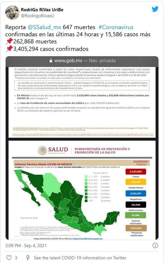 Al corte de este sábado 4 de septiembre, la Secretaría de Salud informó que el país sumó tres millones 420 mil 880 casos de COVID-19, esto luego de registrar 15 mil 586 en las últimas 24 horas.A través de su informe técnico diario sobre el avance de la pandemia de coronavirus en México, la dependencia federal agregó que durante el último día, el país reportó 647 nuevas muertes, para alcanzar un total de 262 mil 868.Con estas cifras, México ocupa el lugar 14 a nivel mundial en número de contagios y el cuarto puesto como el país con más decesos por la pandemia de coronavirus, detrás de Estados Unidos, Brasil y la India, según la Universidad estadounidense Johns Hopkins.Asimismo, las autoridades sanitarias detallaron que las 10 entidades con mayor número de casos son: Ciudad de México, Estado de México, Nuevo León, Guanajuato, Jalisco, Tabasco, Puebla, Veracruz, Sonora y San Luis Potosí, que en conjunto conforman el 66% de todos los casos acumulados registrados en el país.De acuerdo con lo informado por el subsecretario de Prevención y Promoción de la Salud, Hugo López-Gatell, México ha vacunado contra el COVID-19 a un total de 58 millones 472 mil 846 personas, cifra que representa al 65% de la población mayor de 18 años.Informó, además, que el viernes se aplicaron 461 mil 794 dosis del antídoto, con lo que se alcanzaron las 86 millones 307 mil 586 inmunizaciones.Del total de personas inyectadas, abundó, 35 millones 032 mil 194 cuentan con su esquema completo, mientras que 23 millones 440 mil 652 tienen al menos una dosis aplicada.Si te interesó esta noticia y quieres saber más, entonces descarga y descubre INFORMAPlus, la aplicación digital de EL INFORMADOR, en donde tenemos contenidos exclusivos, seleccionados por nuestros editores, para darles una experiencia más completa a los lectores. Si eres suscriptor de EL INFORMADOR tu acceso está incluido, solicítalo al 33 3678-7777Descarga la aplicación y pruébala GRATIS por treinta días.Para iOS: https://apple.co/35jaVgbPara Android: https://bit.ly/3gwVSEVJM