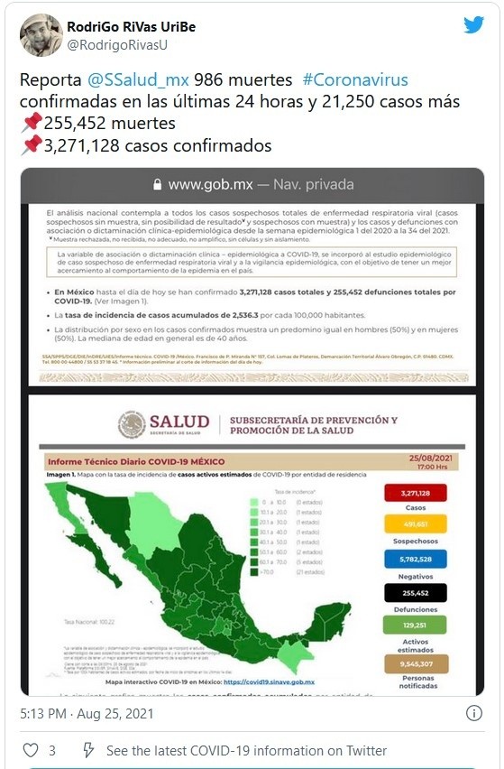 Al corte de este miércoles 25 de agosto, México acumuló 255 mil 452 muertes por COVID-19; esto es, 986 fallecimientos más que el día anterior, informó la Secretaría de Salud.Asimismo, se detalló que en las últimas 24 horas el país sumó 21 mil 250 contagios para dar un total de tres millones 271 mil 128 casos confirmados.Con estas cifras, México ocupa el lugar 14 a nivel mundial en número de contagios y el cuarto puesto como el país con más decesos por la pandemia, detrás de Estados Unidos, Brasil y la India, según la Universidad estadounidense Johns Hopkins.Respecto a los detalles del plan de vacunación, el subsecretario de Prevención y Promoción de la Salud, Hugo López-Gatell, informó a través de Twitter que el martes 24 de agosto se aplicaron 648 mil 942 dosis de vacunas anticovid.Detalló además, que desde el inicio de la estrategia nacional de vacunación se han aplicado en total 81 millones 923 mil 702 dosis.Si te interesó esta noticia y quieres saber más, entonces descarga y descubre INFORMAPlus, la aplicación digital de EL INFORMADOR, en donde tenemos contenidos exclusivos, seleccionados por nuestros editores, para darles una experiencia más completa a los lectores. Si eres suscriptor de EL INFORMADOR tu acceso está incluido, solicítalo al 33 3678-7777Descarga la aplicación y pruébala GRATIS por treinta días.Para iOS: https://apple.co/35jaVgbPara Android: https://bit.ly/3gwVSEVJM