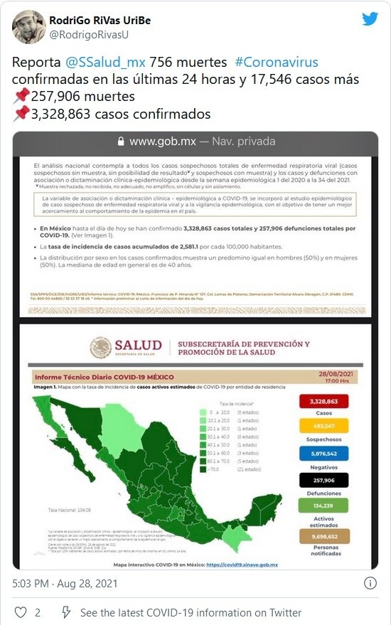 Este sábado, México llegó a tres millones 328 mil 863 contagios de COVID-19, al sumar 17 mil 546 en el último día, informó la Secretaría de Salud. La dependencia federal, agregó, el país alcanzó los 257 mil 906 decesos por la enferemedad, luego de que se registraron 756 desde el último corte.Con estas cifras, México ocupa el lugar 14 a nivel mundial en número de contagios y el cuarto puesto como el país con más decesos por la pandemia de coronavirus, detrás de Estados Unidos, Brasil y la India, según la Universidad estadounidense Johns Hopkins.A través del informe técnico, la dependencia indicó que las 10 primeras entidades que acumulan el mayor número de casos son Ciudad de México, Estado de México, Nuevo León, Guanajuato, Jalisco, Tabasco, Puebla, Veracruz Sonora y San Luis Potosí, que en conjunto conforman el 66% de todos los casos acumulados registrados en el país.Hasta este viernes, informó el subsecretario de Prevención y Promoción de la Salud, Hugo López-Gatell, el país sumó 83 millones 433 mil 577 dosis suministradas de la vacuna contra COVID-19. Lo anterior, explicó, significa que 57 millones 164 mil 235 personas han sido inoculadas con al menos una dosis contra el virus o, lo que es lo mismo, el 64% de la población mayor a 18 años.Si te interesó esta noticia y quieres saber más, entonces descarga y descubre INFORMAPlus, la aplicación digital de EL INFORMADOR, en donde tenemos contenidos exclusivos, seleccionados por nuestros editores, para darles una experiencia más completa a los lectores. Si eres suscriptor de EL INFORMADOR tu acceso está incluido, solicítalo al 33 3678-7777Descarga la aplicación y pruébala GRATIS por treinta días.Para iOS: https://apple.co/35jaVgbPara Android: https://bit.ly/3gwVSEVJM