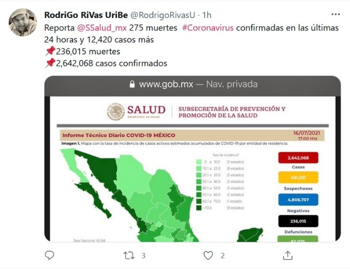 Al corte de este viernes 16 de julio, México acumuló 236 mil 015 muertes por COVID-19; esto es, 275 fallecimientos más que el día anterior, informó la Secretaría de Salud.Asimismo, se detalló que en las últimas 24 horas, el país sumó 12 mil 420 contagios para dar un total de dos millones 642 mil 068 casos confirmados.En el informe técnico, la dependencia indicó que las 10 entidades que acumulan el mayor número de casos son la Ciudad de México, el Estado de México, Guanajuato, Nuevo León, Jalisco, Puebla, Sonora, Tabasco, Querétaro y Veracruz, los cuales conforman el 66% de todos los casos acumulados registrados en el país.Con estas cifras, México ocupa el decimoquinto lugar mundial en número de contagios y el cuarto puesto como el país con más decesos por la pandemia, detrás de Estados Unidos, Brasil y la India, según la Universidad estadounidense Johns Hopkins.Respecto a los detalles del plan de vacunación, el subsecretario de Prevención y Promoción de la Salud, Hugo López-Gatell, informó que al corte de las 21:00 horas del jueves fueron aplicadas a nivel nacional 637 mil 713 dosis de la vacuna contra el COVID-19.Informó además, que desde el inicio de la estrategia nacional de vacunación se han aplicado en total 53 millones 342 mil 673 dosis.JM