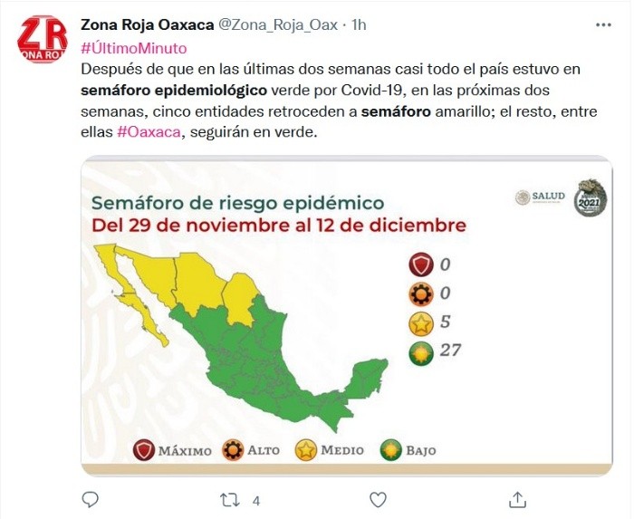 La Secretaría de Salud reportó este viernes 165 nuevas muertes por COVID-19 para un total de 293 mil 614 defunciones confirmadas, además de otros tres mil 445 casos para llegar a tres millones 879 mil 836 contagios.De igual manera, en su actualización del semáforo epidemiológico, detallan que Baja California, Baja California Sur, Sonora, Chihuahua y Coahuila regresarán al color amarillo del 29 de noviembre al 12 de diciembre.De la cifra de casos, hay 22 mil 834 activos, que han presentado síntomas durante los últimos 14 días y suponen el 0.6 % del total. Además, desde el inicio de la pandemia se han recuperado tres millones 236 mil 518 personas.La ocupación media de camas generales se mantiene en 17 % y el uso de camas de terapia intensiva en 14 por ciento.Las autoridades también indicaron que dentro del programa de vacunación, que contempla a todos los mayores de 18 años, se han aplicado más de 131.82 millones de dosis, al sumar 228 mil 705 durante la última jornada. Hasta ahora, 76.29 millones de personas mayores de 18 años tienen al menos una dosis del biológico.De acuerdo con el informe técnico diario emitido por la Secretaría de Salud, Baja California, Baja California Sur, Sonora, Chihuahua y Coahuila regresaron a amarillo, a excepción de Baja California que durante la última actualización se encontraba en color naranja.En medio de la incertidumbre causada por la nueva variante del COVID-19, ómicron, la dependencia a cargo de Jorge Alcocer Varela mantiene a 27 estados del país con el riesgo epidémico bajo; es decir, en color verde, y ninguno en rojo o naranja.De acuerdo con la información de la dependencia, los estados con color amarillo deberán mantener una ligera disminución en el espacio público, además de la operación actividades económicas y sociales con un aforo de 75 por ciento.En cualquier espacio cerrado el uso de cubrebocas será obligatorio y será recomendado en espacios abiertos sin posibilidad de mantener sana distancia y obligatorio en el transporte público.JM