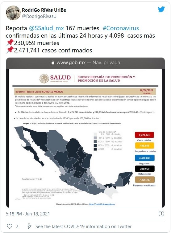 México reportó 167 nuevas muertes por COVID-19 en las últimas 24 horas, con lo que llegó a un total de 230 mil 959 decesos, informó este viernes la Secretaría de Salud en su reporte técnico de la enfermedad.Además, se informó de cuatro mil 253 contagios que elevan a dos millones 471 mil 741 los casos confirmados.Con estas cifras, México se ubica como el cuarto país del mundo con más decesos, por detrás de Estados Unidos, Brasil e India, y el decimoquinto en número de contagios confirmados, según el recuento de la Universidad Johns Hopkins.El reporte señaló que el número de casos activos estimados es de 27 mil 591; es decir, el 1 % del total de los contagiados estimados totales.Además, se reportó a un millón 966 mil 702 personas que se consideran recuperadas después de haber padecido la enfermedad.El informe también apuntó que la ocupación media de camas generales en los hospitales mexicanos es del 16 % y del 14 % para camas de terapia intensiva con respirador.También se informó que a partir del próximo lunes, de las 32 entidades territoriales que integran el territorio mexicano, 16 estarán en el color verde del semáforo de riesgo epidemiológico.Además, ocho estarán en color amarillo, cinco en naranja y ninguna en rojo. La medida sanitaria tendrá una vigencia de dos semanas.Con respecto a la vacunación en el país, el reporte informó que ya se han administrado 39.2 millones de dosis de la vacuna anticovid, 519 mil 874 durante el jueves.Además, indicó que un total de 15 millones 825 mil 432 personas han recibido las dosis necesarias para completar el esquema de vacunación.JM