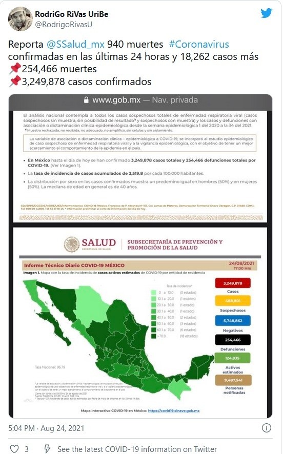 Al corte de este martes 24 de agosto, México acumuló 254 mil 466 muertes por COVID-19; esto es, 940 fallecimientos más que el día anterior, informó la Secretaría de Salud. Asimismo, se detalló que en las últimas 24 horas el país sumó 18 mil 262 contagios, para dar un total de tres millones 249 mil 878 casos confirmados.Con estas cifras México ocupa el lugar 14 a nivel mundial en número de contagios y el cuarto puesto como el país con más decesos por la pandemia, detrás de Estados Unidos, Brasil y la India, según la Universidad estadounidense Johns Hopkins.Respecto a los detalles del plan de vacunación, el subsecretario de Prevención y Promoción de la Salud, Hugo López-Gatell, informó a través de Twitter que el lunes 23 de agosto se aplicaron 388 mil 148 dosis de la vacuna anticovid. Detalló además, que desde el inicio de la estrategia nacional de vacunación se han aplicado en total 81 millones 274 mil 760 dosis de la vacuna.La Secretaría de Salud aseguró que la tercera ola por COVID-19 en México presenta una reducción al menos en 17 entidades federativas, lo que es un buen indicador; sin embargo, llamó a la población a no bajar la guardia y mantener las medidas de higiene y sana distancia."Son ya 17 entidades las que tienen reducción a partir de esta semana, Sinaloa presenta cinco semanas de reducción y ya continuamente está reduciendo en casos y hospitalizaciones, esto significa que la epidemia tiene signos de reducción en esta tercera ola, pero mientras exista epidemia en una parte del mundo, hay que mantener medidas de prevención y no perder la oportunidad de vacunarse, hasta ahora la más específica para reducir enfermedad grave y muerte", dijo Hugo López-Gatell Ramírez, subsecretario de Prevención y Promoción de la Salud.Si te interesó esta noticia y quieres saber más, entonces descarga y descubre INFORMAPlus, la aplicación digital de EL INFORMADOR, en donde tenemos contenidos exclusivos, seleccionados por nuestros editores, para darles una experiencia más completa a los lectores. Si eres suscriptor de EL INFORMADOR tu acceso está incluido, solicítalo al 33 3678-7777Descarga la aplicación y pruébala GRATIS por treinta días.Para iOS: https://apple.co/35jaVgbPara Android: https://bit.ly/3gwVSEVJM