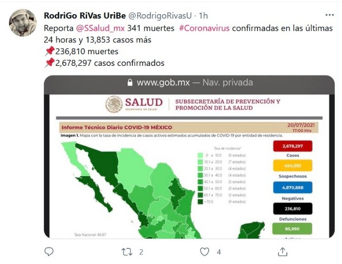 La Secretaría de Salud registró este martes 13 mil 853 contagios y 341 nuevas muertes por COVID-19, con lo que el país acumula dos millones 678 mil 297 casos y 236 mil 810 decesos confirmados desde el inicio de la pandemia.Con estas cifras, México se mantiene como el cuarto país con más muertes por COVID-19, detrás de Estados Unidos, Brasil y la India, y es decimosexto en número de contagios confirmados, según el recuento de la Universidad Johns Hopkins.Estas cifras se dan en medio de una tercera oleada de contagios, principalmente entre gente joven y adultos no vacunados a raíz del avance de la variante Delta del coronavirus SARS-CoV-2.Las autoridades sanitarias estiman que el número real de contagios es de dos millones 869 mil 606. De esta cifra, están activos 85 mil 990 casos que han presentado síntomas durante los últimos 14 días y que representan el 2.9 % del total.La ocupación media de camas generales en los hospitales mexicanos es del 34 % y del 27 % para camas de terapia intensiva.El informe indicó también que hasta ahora se han administrado 55 millones de dosis de la vacuna anticovid, al sumar 565 mil 173 en la última jornada.También precisó que 21.9 millones de personas han recibido las dosis necesarias para completar el esquema de vacunación en México, que tiene 126 millones de habitantes.JM