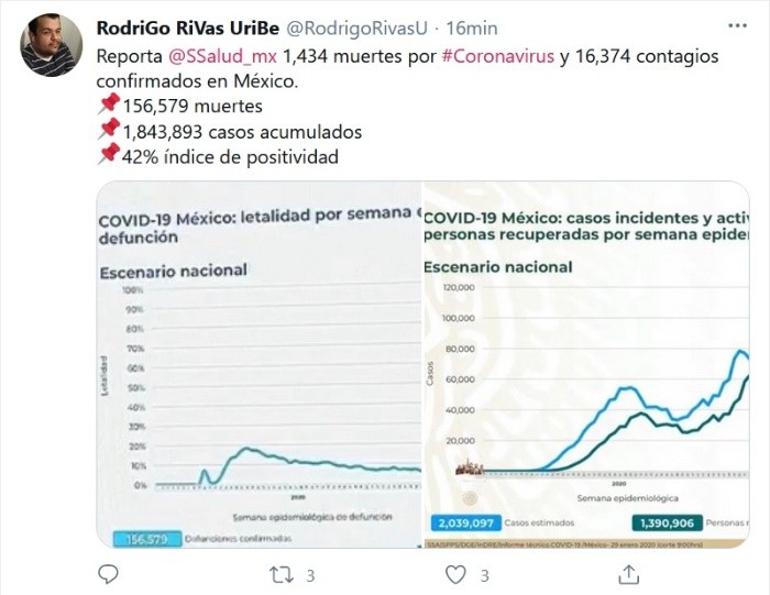 La Secretaría de Salud dio a conocer durante su informe técnico de este 29 de enero de 2021, que hay 16 mil 374 nuevos contagios, así como mil 434 defunciones originadas por COVID-19 en México.De esa forma, se han registrado un millón 841 mil 893 casos confirmados acumulados y 156 mil 579 defunciones ocasionadas por la enfermedad, con un porcentaje de letalidad del seis por ciento.Las autoridades también reportaron la existencia de dos millones 365 mil 303 casos negativos y cuatro millones 642 mil 539 personas estudiadas desde el primer caso registrado en el país; asimismo, hasta el día de hoy un millón 390 mil 906 personas han sido dadas de alta al recuperarse de la enfermedad.Por otro lado, se estima que 110 mil 602 pacientes forman parte de la pandemia activa. Ellos son quienes pueden contribuir potencialmente a la transmisión del nuevo coronavirus. Acerca de los casos estimados, la cifra se colocó en dos millones 039 mil 097 personas.JM