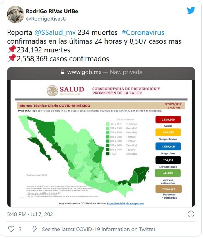 México reportó 234 nuevas muertes por COVID-19 en las últimas 24 horas, para un total 234 mil 192 fallecimientos, informó este miércoles la Secretaría de Salud, que también indicó que el país llegó a 48.5 millones de vacunas aplicadas contra este virus.Además, el informe técnico diario registró ocho mil 507 nuevos contagios que elevan a dos millones 558 mil 369 los casos confirmados.El reporte de este miércoles indicó que, desde el comienzo de la emergencia, México ha estudiado 7.64 millones de pacientes.Además, las autoridades sanitarias estiman que el número real de contagios es de dos millones 745 mil 730. De esta cifra, están activas 48 mil personas que han presentado síntomas durante los últimos 14 días y que representan poco más del 1.7 % del total.También se reportó que dos millones 027 mil 541 personas están consideradas como recuperadas después de haber padecido la enfermedad.La ocupación media de camas generales en los hospitales mexicanos es del 21 % y del 18 % para camas de terapia intensiva.El informe indicó también que hasta ahora se han administrado 48 millones 499 mil 324 dosis de la vacuna anticovid, al sumar 759 mil 541 en la jornada del martes.Además, precisó que 20.04 millones de personas han recibido las dosis necesarias para completar el esquema de vacunación en México, que tiene 126 millones de habitantes.JM