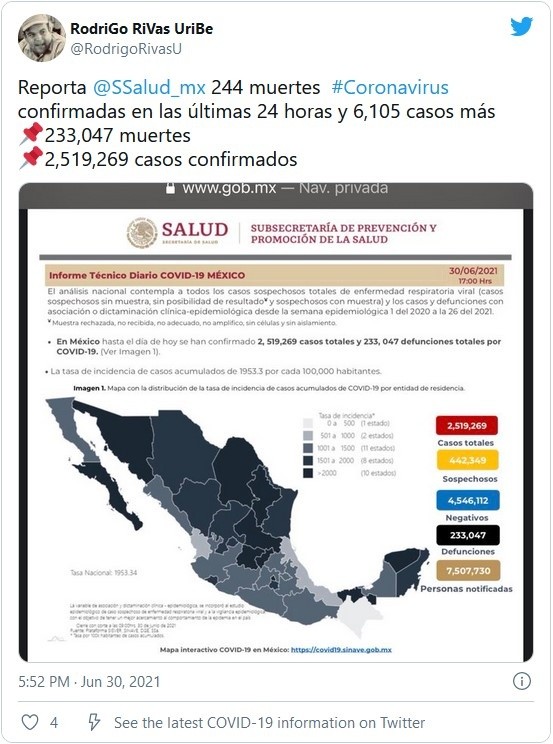 México reportó 244 nuevas muertes por COVID-19 en las últimas 24 horas, para un total de 233 mil 047 decesos, informó este miércoles la Secretaría de Salud, que también indicó que el país llegó a 45.11 millones de vacunas aplicadas.Además, el informe técnico diario registró seis mil 105 nuevos contagios que elevan a dos millones 519 mil 269 los casos confirmados.Con estas cifras, México se sitúa como el cuarto país con más decesos, por detrás de Estados Unidos, Brasil e India, y el decimoquinto en número de contagios confirmados, según el recuento de la Universidad Johns Hopkins.El reporte de este martes indicó que, desde el comienzo de la emergencia, México ha estudiado 7.5 millones de pacientes.Además, las autoridades sanitarias estiman que el número real de contagios es de dos millones 705 mil 632. De esta cifra están activas 38 mil 179 personas que han presentado síntomas durante los últimos 14 días y que representan poco más del 1 % del total.La ocupación media de camas generales en los hospitales mexicanos es del 19 % y del 15 % para camas de terapia intensiva.La ocupación hospitalaria ha disminuido un 85 % respecto al pico máximo alcanzado en enero, cuando se saturaron los hospitales de varias ciudades, entre ellas la capital.Con respecto a las defunciones, Ciudad de México -el foco de la pandemia- acumula el 19.1 % de todos los decesos a nivel nacional, es decir, casi una de cada cinco muertes.El informe indicó que hasta ahora se han administrado 45.11 millones de dosis de la vacuna anticovid, al sumar 709 mil 366 en la jornada del martes.Además, indicó que 19.35 millones de personas han recibido las dosis necesarias para completar el esquema de vacunación en México, que tiene 126 millones de habitantes.JM