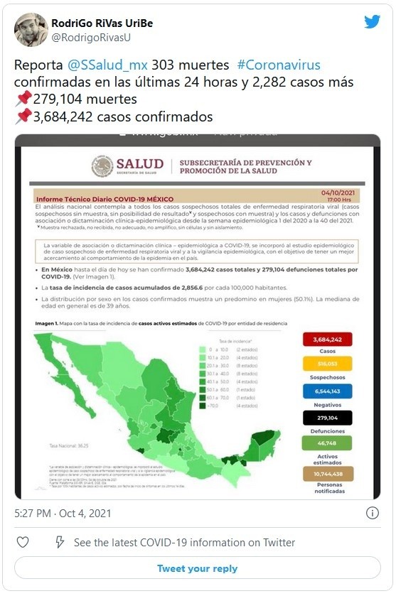 Al corte del lunes 4 de octubre, en el país se contabilizan 279 mil 104 muertes por COVID-19, lo que representa 303 defunciones más que ayer, informó la Secretaría de Salud (Ssa) en su reporte técnico diario de la situación del COVID-19 en México.Asimismo, la dependencia dio a conocer que desde el inicio de la pandemia, México acumula tres millones 684 mil 242 casos positivos al virus, reportando dos mil 282 contagios más que en las últimas 24 horas.A su vez, en el país existen 46 mil 748 casos activos, es decir, aquellos casos positivos que iniciaron síntomas en los últimos 14 días; mientras que se contabilizan 516 mil 53 sospechosos.Tras la actualización quincenal que realiza la Secretaría de Salud del semáforo de riesgo epidémico por COVID-19 en la semana que va del 4 al 17 de octubre, el país se pintó de amarillo al colocar a 22 estados en ese color, otros nueve en verde, uno en naranja y ninguno en rojo.Los estados que están en amarillo son: Sonora, Coahuila, Nuevo León, Tamaulipas, Veracruz, San Luis Potosí, Guanajuato, Aguascalientes, Jalisco, Nayarit, Colima, Michoacán, Estado de México, Querétaro, Hidalgo, Morelos, Ciudad de México, Tlaxcala, Puebla, Tabasco, Campeche y Yucatán.En tanto, los estados que están en verde son Baja California Sur, Chihuahua, Sinaloa, Durango, Zacatecas, Guerrero, Oaxaca, Chiapas y Quintana Roo, mientras que el único estado en naranja es Baja California.Si te interesó esta noticia y quieres saber más, entonces descarga y descubre INFORMAPlus, la aplicación digital de EL INFORMADOR, en donde tenemos contenidos exclusivos, seleccionados por nuestros editores, para darles una experiencia más completa a los lectores. Si eres suscriptor de EL INFORMADOR tu acceso está incluido, solicítalo al 33 3678-7777.Descarga la aplicación y pruébala GRATIS por treinta días.Para iOS: https://apple.co/35jaVgbPara Android: https://bit.ly/3gwVSEVJM