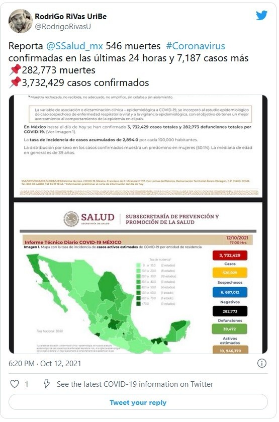 Al corte del martes 12 de octubre, México registró tres millones 732 mil 429 casos positivos de COVID-19 desde el inicio de la pandemia y 282 mil 773 muertes, informó la Secretaría de Salud federal en su reporte técnico diario sobre la situación de la pandemia en México.Las cifras mencionadas indican que en las últimas 24 horas se acumularon siete mil 187 contagios más del virus SARS-CoV-2 así como 546 muertes, con base en los datos aportados por la dependencia.Cabe resaltar que de las 282 mil 773 defunciones reportadas por COVID-19, 13 mil 424 de ellas fueron reportadas como sospechosas; es decir, que incluyen las muertes pendientes por confirmar por laboratorio y las que están en proceso de dictaminación epidemiológica.Por otro lado, se tiene registro de 526 mil 929 infecciones sospechosas, mientras que se estima la existencia de 39 mil 472 casos activos, que corresponden a los que iniciaron síntomas en los últimos 14 días y aún pueden transmitir el virus.En tanto, la dependencia informó que las 10 entidades que acumulan el mayor número de casos de COVID-19 son la Ciudad de México, Estado de México, Nuevo León, Guanajuato, Jalisco, Tabasco, Puebla, Veracruz, Sonora y San Luis Potosí, que en conjunto conforman más de dos tercios (66%) de todos los casos acumulados registrados en el país.Con base en el conteo mundial de la Universidad Johns Hopkins, México es el cuarto país con más muertes por COVID-19. India está en tercer lugar; Brasil, en segundo y Estados Unidos se mantiene en primera posición en defunciones por el SARS-CoV-2.El subsecretario de Prevención y Promoción de la Salud, Hugo López-Gatell, informó que durante 10 semanas consecutivas se ha reducido la intensidad de la tercera ola de la epidemia en el país y que al corte del 11 de octubre se han suministrado 107 millones 921 mil 674 dosis de la vacuna contra el COVID-19.En tanto, el 11 de octubre se aplicaron 540 mil 197 dosis del biológico contra el virus, con lo que se estima que el 75 % de la población de 18 años en adelante ya se encuentra inmunizada al menos con una dosis de la vacuna.JM