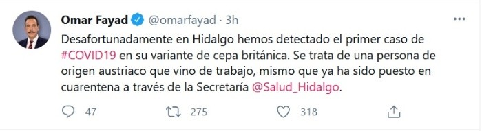 El gobernador de Hidalgo, Omar Fayad Meneses, confirmó que el ciudadano austriaco que se encuentra en aislamiento forzoso en esta entidad dio positivo a la cepa británica de COVID-19.A través de sus redes sociales, el mandatario señaló, "desafortunadamente en Hidalgo hemos detectado el primer caso de COVID-19 en su variante británica. Se trata de una persona de origen austriaco que vino de trabajo, mismo que ya ha sido puesto en cuarentena a través de la Secretaría".El titular de Salud de esta entidad, Efraín Benítez Herrera, había dado a conocer que se tenía en aislamiento forzoso a un ciudadano extranjero que dio positivo a COVID-19.En un primer momento se desconocía si esta persona se infectó en territorio nacional o ya tenia la enfermedad; sin embargo ya fue confirmado con la cepa británica.Precisó que el ciudadano extranjero está en aislamiento forzoso.El funcionario dijo que el laboratorio de Salud Estatal en conjunto con la Universidad Politécnica trabajan en la búsqueda y secuenciación genómica de las nuevas variantes de COVID-19 que han sido detectadas por la Organización Mundial de la Salud.Señaló que se tienen dos criterios para la investigación en las que se incluye a todo paciente sospechoso o positivo que haya viajado al extranjero y quien haya tenido contacto con alguien positivo que haya viajado al extranjero.Indicó que se pondrá mayor atención en los municipios que tiene una alta movilidad de personas que viajan al extranjero como Tula, Pachuca, Ixmiquilpan, Apan y Tulancingo.JM