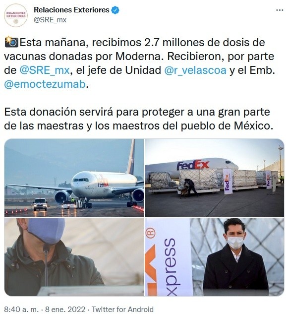 Un cargamento de 2 millones 772 mil vacunas Moderna contra el COVID-19 llegaron este sábado a las 06:45 horas al Aeropuerto Internacional de Toluca (AIT).El lote de vacunas fue donado por la farmacéutica Moderna. Es la tercera ocasión que el país recibe biológicos de este laboratorio, con lo que suman 6 millones 272 mil dosis.En punto de las 06:45 horas aterrizó el vuelo FX53 proveniente Memphis, Tennessee, Estados Unidos y de acuerdo con la Secretaría de Salud federal, hasta el momento el país ha recibido 144 millones 308 mil 795 vacunas envasadas de Pfizer-BioNTech, AstraZeneca, Sinovac, Centro Nacional de Investigación de Epidemiología y Microbiología Gamaleya, CanSino Biologics, Johnson & Johnson y Moderna.Además, en territorio mexicano, el laboratorio Drugmex ha envasado 14 millones 024 mil 840 dosis de CanSino Biologics.Mientras que el laboratorio Liomont 42 millones 966 mil 100 biológicos de AstraZeneca, lo que hace un total de 56 millones 990 mil 940 vacunas envasadas en el país.En suma, desde el 23 de diciembre de 2020, México ha tenido disponibles 201 millones 299 mil 735 biológicos.OA