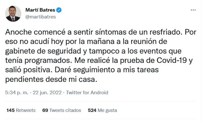 El secretario de Gobierno de la Ciudad de México, Martí Batres, informó que dio positivo a COVID-19, por lo que se mantiene aislado y trabajando desde casa.A través de su cuenta de Twitter, Batres Guadarrama explicó que tuvo síntomas de resfriado, por lo que se realizó la prueba, la cual dio positivo."Anoche comencé a sentir síntomas de un resfriado. Por eso no acudí hoy por la mañana a la reunión de gabinete de seguridad y tampoco a los eventos que tenía programados. Me realicé la prueba de COVID-19 y salió positiva. Daré seguimiento a mis tareas pendientes desde mi casa.", señaló el funcionario.Este contagio se da un día después de que la jefa de gobierno, Claudia Sheinbaum, superara esta enfermedad.JM