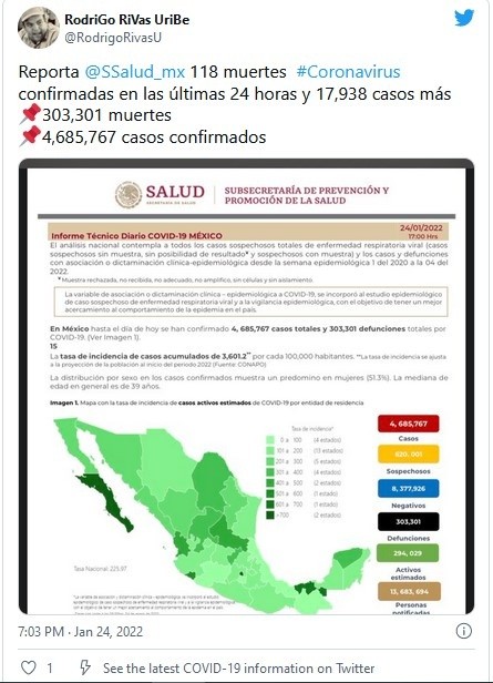 México registró este lunes 17 mil 938 nuevos contagios de COVID-19 para llegar a un total de cuatro millones 685 mil 767 casos, además de 118 muertes para totalizar 303 mil 301 decesos, informó la Secretaría de Salud.En la pasada semana, el país reportó sus cifras más altas de contagios, con un récord histórico de 60 mil 552 el miércoles y 51 mil 368 el sábado, además de muertes diarias por encima de las 300.Con estas cifras, México es el decimocuarto país en el mundo en número de contagios confirmados y es el quinto con más decesos por esta causa, por detrás de Estados Unidos, Brasil, India y Rusia, según el recuento de la Universidad Johns Hopkins.De los contagios confirmados, hay 294 mil 029 casos activos, que han presentado síntomas durante los últimos 14 días y suponen el 5.9 % del total. Además, desde el inicio de la pandemia se han recuperado tres millones 761 mil 113 personas.La ocupación media de camas generales se sitúa en un 43 % y la de terapia intensiva en un 25 por ciento.Las autoridades también indicaron que dentro del programa de vacunación se han administrado 160.82 millones de dosis, al sumar 240 mil 832 durante la última jornada.De los 126 millones de habitantes, 83.33 millones en el país han recibido al menos una dosis de la vacuna, con lo que 89 % de la población de 18 años y más han recibido al menos una dosis. En tanto, 76.56 millones han completado su esquema de vacunación.JM