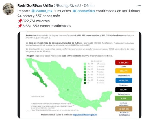 México reportó este lunes 11 nuevas muertes y 657 contagios por COVID-19, con lo que totaliza cinco millones 651 mil 553 casos y acumula 322 mil 761 decesos en total, informó la Secretaría de Salud.Con estos datos, México es el vigésimo país en el mundo en número de contagios confirmados y es el quinto con más decesos por esta causa, por detrás de Estados Unidos, Brasil, India y Rusia, según el recuento de la Universidad Johns Hopkins.Las autoridades sanitarias reconocen que, con base en las actas de defunción, el país puede rozar los 460 mil fallecimientos y estiman que México acumula en realidad cinco millones 929 mil 814 contagios.De los contagios confirmados, hay ocho mil 657 casos activos, que han presentado síntomas durante los últimos 14 días y suponen el 0.1% del total.Además, desde el inicio de la pandemia se han recuperado cuatro millones 950 mil 686 personas.La ocupación media de camas generales se sitúa en un 5% y la de terapia intensiva en un 5% con un descenso de un punto porcentual en ambos casos respecto al domingo.Las autoridades también indicaron que dentro del programa de vacunación se han administrado más de 190.44 millones de dosis, al sumar 103 mil 807 durante la última jornada.De los 126 millones de habitantes, 85.57 millones de mexicanos han recibido al menos una dosis de la vacuna, con lo que el 90% de la población de 18 años y más ha recibido al menos una aplicación.En tanto, 79.69 millones de personas han completado su pauta de vacunación.Desde finales de diciembre de 2020 han llegado al país 224.35 millones de dosis de las vacunas Pfizer, Johnson & Johnson y Moderna, de Estados Unidos; la británica AstraZeneca, la rusa Sputnik V y las chinas CanSino y Sinovac. MF
