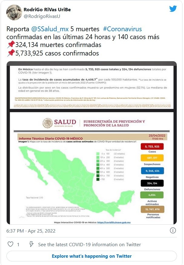 Al corte de este 25 de abril, la Secretaría de Salud (Ssa) reportó cinco muertos por COVID, con lo que sumó 324 mil 134 fallecidos por la enfermedad.Además, informó que se añadieron 140 contagios las últimas 24 horas, lo que sumó cinco millones 733 mil 925 casos totales, desde el inicio de la pandemia en México.La dependencia detalló que la distribución de los casos estimados por los grupos de edad seleccionados y semana epidemiológica del 2021, en las últimas cinco semanas, la mayor parte de los casos están presentes en los grupos de 18 a 29 años, seguido del grupo de 30 a 39 años y 40 a 49 años.La Ssa expuso los casos confirmados acumulados por entidad de residencia, las 10 primeras entidades que acumulan el mayor número de casos son: Ciudad de México, Estado de México, Nuevo León, Guanajuato, Jalisco, Tabasco, San Luis Potosí, Veracruz, Puebla y Sonora, que en conjunto conforman el 65% de todos los casos acumulados registrados en el país.JM