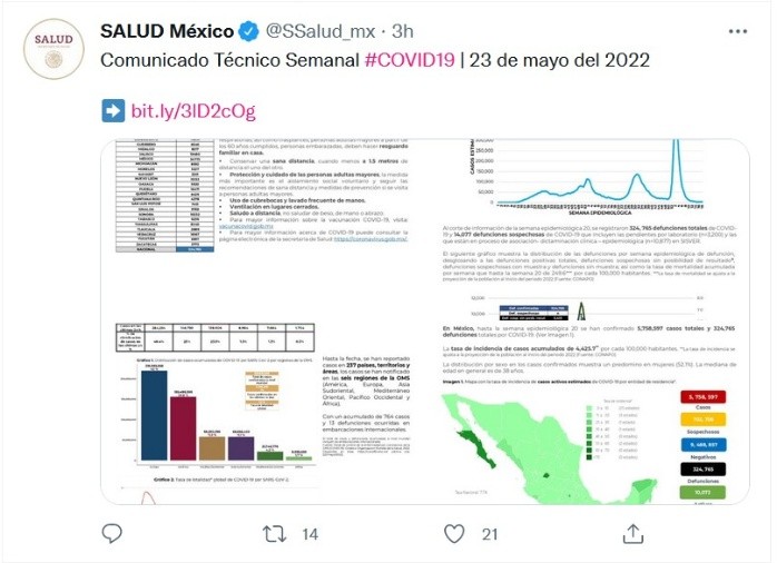 La Secretaría de Salud (Ssa), en su informe semanal, reportó 154 fallecidos por COVID-19, lo que sumó 324 mil 765 muertes por la enfermedad. Además, registró siete mil 018 contagios, cifra con la que el país acumuló cinco millones 758 mil 597 casos totales del virus.La dependencia expuso que, en las últimas cinco semanas, la mayor parte de los casos están presentes en los grupos de 18 a 29 años, seguido del grupo de 30 a 39 años y 40 a 49 años.Asimismo, Salud detalló que la distribución por sexo en las defunciones confirmadas muestra un predomino del 62% en hombres; la mediana de edad en los decesos es de 64 años.La Ssa reportó que los casos confirmados acumulados por entidad de residencia, las 10 primeras entidades que acumulan el mayor número de casos son: Ciudad de México, Estado de México, Nuevo León, Guanajuato, Jalisco, Tabasco, San Luis Potosí, Veracruz, Puebla y Sonora, que en conjunto conforman el 65% de todos los casos acumulados registrados en el país.Desde el 24 de diciembre de 2020 se han aplicado 208 millones 185 mil 593 mil vacunas anticovid a 87 millones 712 mil 002 personas y se han aplicado 53 millones 032 mil 896 dosis de refuerzo a personas mayores de 18 años, lo que representa 66 % de avance en la cobertura.Además, la Secretaría de Salud reportó que han recibido al menos una dosis seis millones 634 mil 711 personas de 12 a 17 años, que representa 50 % de este grupo.La dependencia también refiere que México cuenta con 98 % de disponibilidad de camas generales y 99 % con respirador mecánico para la atención de personas con COVID-19.JM