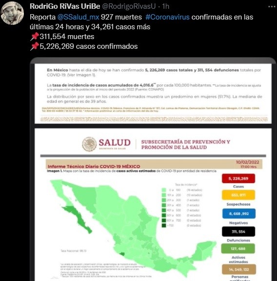 México registró este jueves 34 mil 261 nuevos contagios de COVID-19 para llegar a un total de cinco millones 226 mil 269 casos, además de que acumula 311 mil 554 decesos al sumar este día 927 muertes, la cifra más alta de la cuarta ola, informó la Secretaría de Salud.Los 927 decesos implican la cifra más alta durante la cuarta ola tras las 829 reportadas el 1 de febrero, y apenas el miércoles el país había registrado 743 decesos.Con estos datos, México es el decimosexto país en el mundo en número de contagios confirmados y es el quinto con más decesos por esta causa, por detrás de Estados Unidos, Brasil, India y Rusia, según el recuento de la Universidad Johns Hopkins.De los contagios confirmados, hay 127 mil 688 casos activos, que han presentado síntomas durante los últimos 14 días y suponen el 2.3% del total.Además, desde el inicio de la pandemia se han recuperado cuatro millones 438 mil 581 personas.La ocupación media de camas generales se sitúa en un 36% y la de terapia intensiva en un 25 por ciento.Las autoridades también indicaron que dentro del programa de vacunación se han administrado más de 170.71 millones de dosis, al sumar 500 mil 77 durante la última jornada.De los 126 millones de habitantes, 83.97 millones de mexicanos han recibido al menos una dosis de la vacuna, con lo que 89% de la población de 18 años y más han recibido al menos una aplicación.En tanto, 77.7 millones han completado su esquema de vacunación.MF