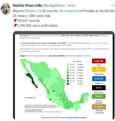 México reportó este lunes 42 nuevas muertes y mil 684 contagios por el COVID, con lo que totaliza cinco millones 566 mil 669 casos y acumula 319 mil 901 decesos en total, informó la Secretaría de Salud.La cifra de decesos reportada este día es la segunda más baja de la cuarta ola, tras la de ayer que fue de 35, aunque en domingo y lunes los números de muertes y contagios bajan considerablemente debido al procesamiento de información del fin de semana.Con estos datos, México es el decimosexto país en el mundo en número de contagios confirmados y es el quinto con más decesos por esta causa, por detrás de Estados Unidos, Brasil, India y Rusia, según el recuento de la Universidad Johns Hopkins.De los contagios confirmados, hay 25 mil 964 casos activos, que han presentado síntomas durante los últimos 14 días y suponen el 0.4% del total.Además, desde el inicio de la pandemia se han recuperado cuatro millones 853 mil 879 personas. La ocupación media de camas generales se sitúa en un 13% y la de terapia intensiva en un 10% con tendencia a la baja.Respecto a las defunciones, Ciudad de México, el foco de la pandemia, acumula cerca del 17.3% de todos los decesos a nivel nacional. Desde este lunes y hasta el 20 de marzo de los 32 estados del país ninguno estará en semáforo de riesgo epidemiológico rojo (máximo riesgo de contagios), ni en naranja (riesgo alto) y sólo habrá 1 en amarillo (riesgo medio) y 31 en verde (riesgo bajo), entre ellos la Ciudad de México.Las autoridades también indicaron que dentro del programa de vacunación se han administrado más de 183.62 millones de dosis, al sumar 57 mil 871 durante la última jornada.De los 126 millones de habitantes, casi 85.34 millones de mexicanos han recibido al menos una dosis de la vacuna, con lo que el 90 % de la población de 18 años y más ha recibido al menos una aplicación.En tanto, 79.12 millones de personas han completado su pauta de vacunación.MF