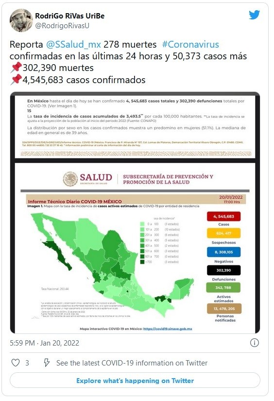 México registró este jueves 50 mil 373 nuevos contagios de COVID-19 para un total de cuatro millones 545 mil 683 casos, además de 278 muertes para llegar a 302 mil 390 decesos totales, informó la Secretaría de Salud.El miércoles se reportaron 60 mil 552, la cifra más alta de contagios diarios de la pandemia. Apenas el martes, el país había sumado 49 mil 343 nuevos contagios, cifra máxima, y venía de un semana con jornadas de más de 40 mil contagios.De la cifra de casos confirmados, hay 342 mil 788 activos, que han presentado síntomas durante los últimos 14 días y suponen el 7.1 % del total. Además, desde el inicio de la pandemia se han recuperado tres millones 583 mil 463 personas.La ocupación media de camas generales en los hospitales mexicanos se sitúa en un 38 % y el uso de camas de terapia intensiva en un 22 por ciento.El encargado de la gestión de la pandemia en el país, Hugo López-Gatell, afirmó el martes que los casos de COVID provocados por la variante ómicron en México son 10 veces mayores que las hospitalizaciones y defunciones.Las autoridades también indicaron que dentro del programa de vacunación se han administrado 157.88 millones de dosis, al sumar 720 mil 356 durante la última jornada.De 126 millones de habitantes que hay en el país, 83 millones tienen al menos una dosis de la vacuna. En tanto, 76.2 millones ha completado su esquema de vacunación.JM
