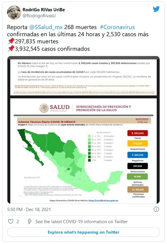 A causa del COVID-19, durante las últimas horas fallecieron 268 personas, de acuerdo con la Secretaría de Salud; además, en su reporte diario notificó dos mil 530 nuevos contagios.A la fecha, según la dependencia, México contabiliza tres millones 932 mil 545 casos y 297 mil 835 muertes por el virus.El informe precisa que las entidades que acumulan el mayor número de casos confirmados acumulados son: Ciudad de México, Estado de México, Nuevo León, Guanajuato, Jalisco, Tabasco, Puebla, Veracruz, Sonora y San Luis Potosí, que en conjunto conforman el 65% de todos los casos acumulados registrados en el país.Agrega que la tasa de casos activos por cada cien mil habitantes se registra en Baja California, Baja California Sur, Chihuahua, Sonora, Aguascalientes, Coahuila, Guanajuato, Ciudad de México, San Luis Potosí y Durango.De acuerdo con la Universidad Johns Hopkins, México se mantiene como el cuarto país con más muertes por COVID-19 y está antecedido por Estados Unidos, Brasil y la India.JM