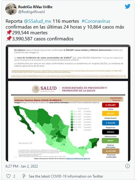 La Secretaría de Salud (SSa) informó este domingo que México registró 116 nuevas muertes por COVID-19 para llegar a 299 mil 544 decesos totales, así como 10 mil 864 nuevos contagios para un total de tres millones 990 mil 587 casos acumulados.Los 10 mil 864 contagios superaron los 10 mil 037 casos del 31 de diciembre, último día del año.En menos de una semana, el país duplicó el número de contagios por el virus, ya que pasado el miércoles registró cinco mil 290 casos y el viernes la cifra fue 10 mil 037, mientras que este domingo se acercó a los 11 mil casos confirmados.De la cifra total de casos, hay 48 mil 801 activos, que han presentado síntomas durante los últimos 14 días y suponen el 1.2 % del total. Además, desde el inicio de la pandemia se han recuperado tres millones 312 mil 333 personas.La ocupación media de camas generales se sitúa en un 14 % y el uso de camas de terapia intensiva en un 12 por ciento.El Gobierno mexicano detectó a la primera persona contagiada con la variante ómicron el 3 de diciembre, y desde entonces suman más de 40 casos confirmados por la Ciudad de México, Estado de México, Nuevo León y Sinaloa.Las autoridades también indicaron que dentro del programa de vacunación se han aplicado 148.94 millones de dosis, al sumar cuatro mil 753 durante la última jornada.De sus 126 millones de habitantes, 81.91 millones en el país tienen al menos una dosis de la vacuna, es decir, el 88 % del total de la población. De ese total, el 89 % (72.84 millones) ha completado su esquema de vacunación.JM